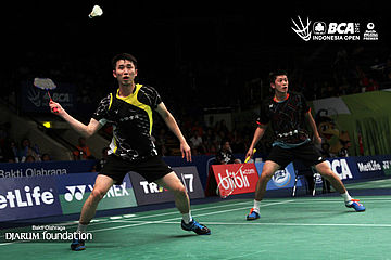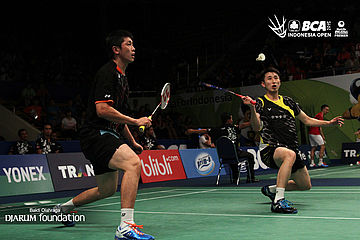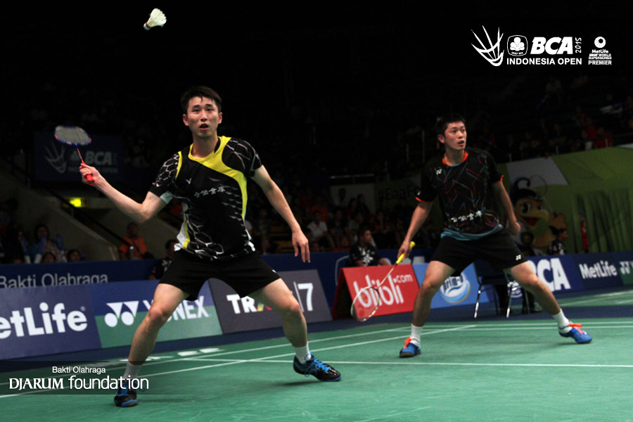 Lee Sheng Mu/Tsai Chia Hsin (China Taipei) mengembalikan shuttlecock ke arah Ko Sung Hyun/Shin Baek Choel (Korea).
