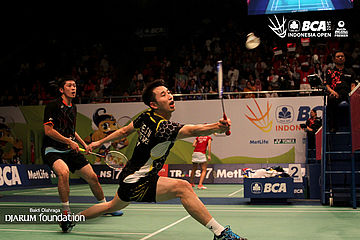 Tommy Sugiarto (Indonesia) mengembalikan shuttlecock ke arah Marc Zwiebler (Jerman).