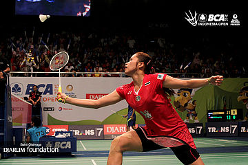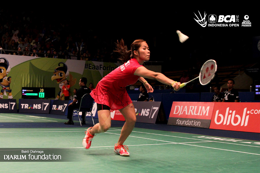Ratchanok Intanon (Thailand) mengembalikan shuttlecock ke arah Busanan Ongbumrungpan (Thailand).