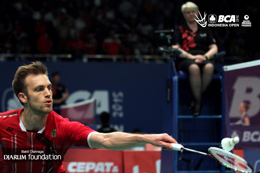 Marc Zwiebler (Jerman) mengembalikan shuttlecock ke arah Tommy Sugiarto (Indonesia).