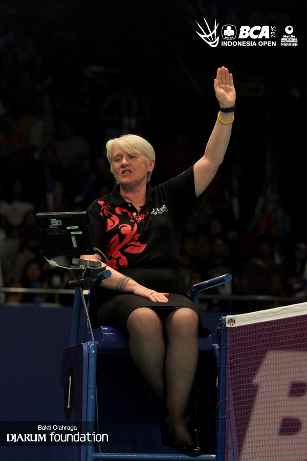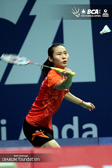 Wang Yihan (China) menyambut pengembalian dari Karin Schnaase (Jerman).