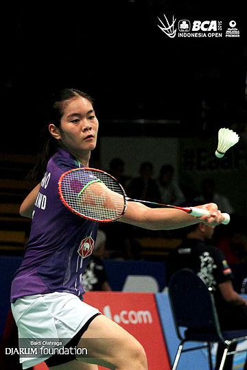 Busanan Ongbumrungpan (Thailand) mengembalikan shuttlecock ke arah Ratchanok Intanon (Thailand).