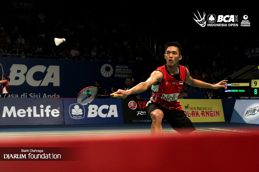 Jonathan Christie (Indonesia) mengembalikan shuttlecock ke arah Lee Hyun Il (Korea).