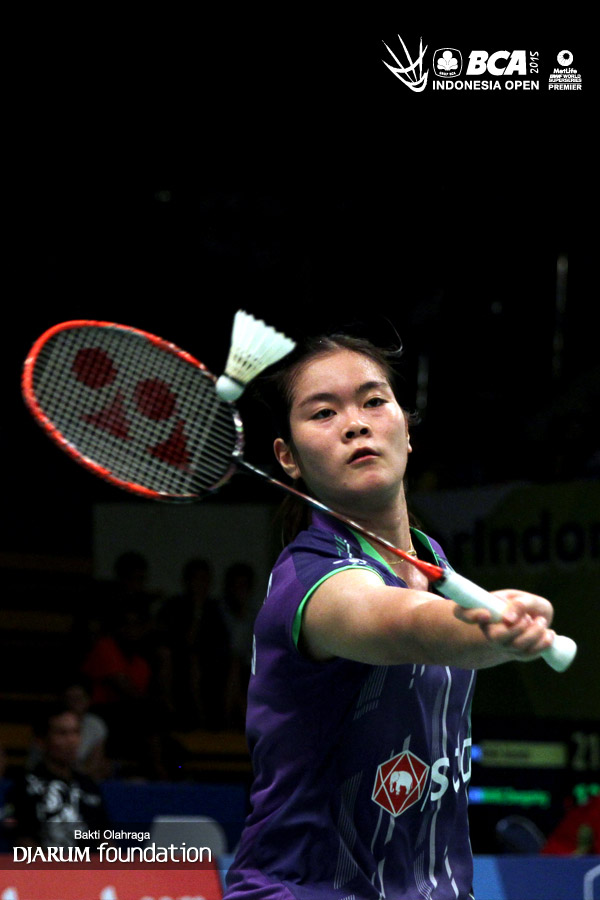Busanan Ongbumrungpan (Thailand) menghadang serangan yang dilepaskan Ratchanok Intanon (Thailand).