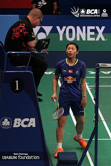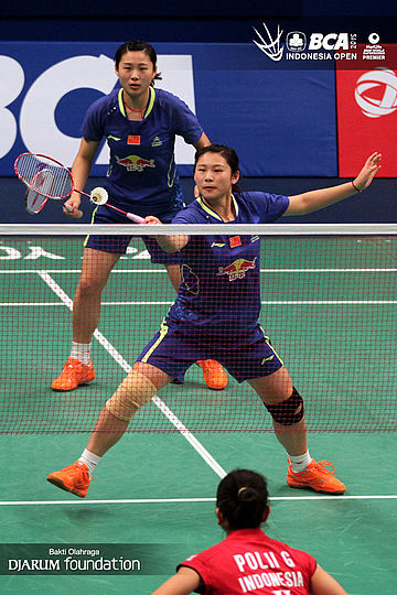 Luo Ying/Luo Yu (China) menyambut pengembalian dari Greysia Polii/Nitya Krishinda (Indonesia).
