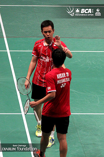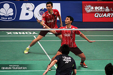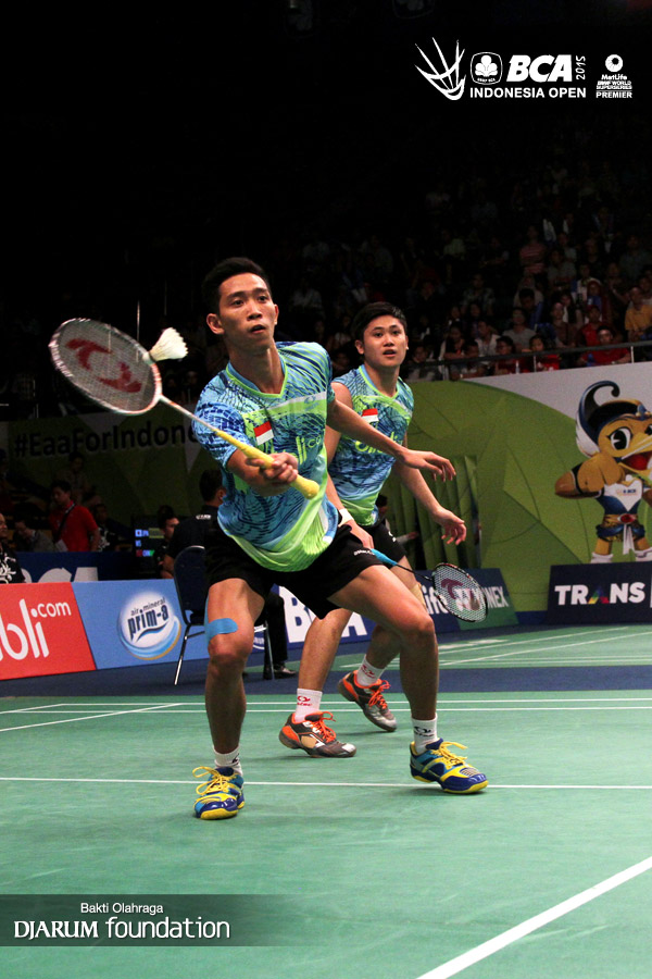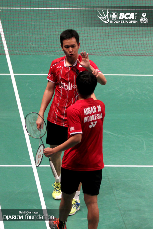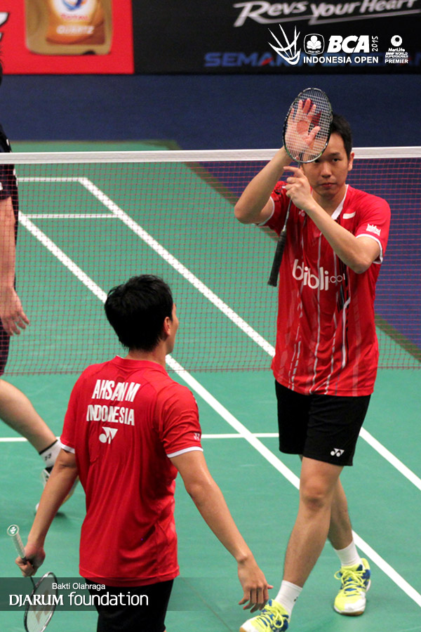Kekompakan Hendra Setiawan/Mohamad Ahsan (Indonesia) di lapangan.
