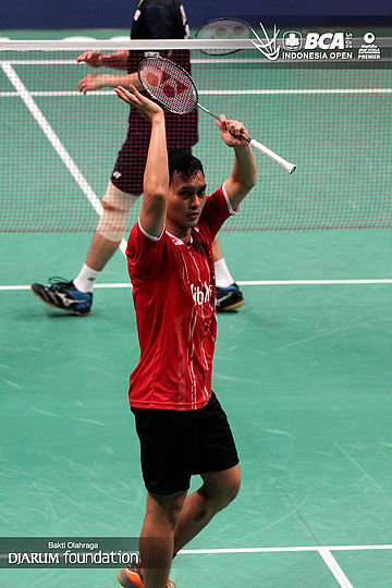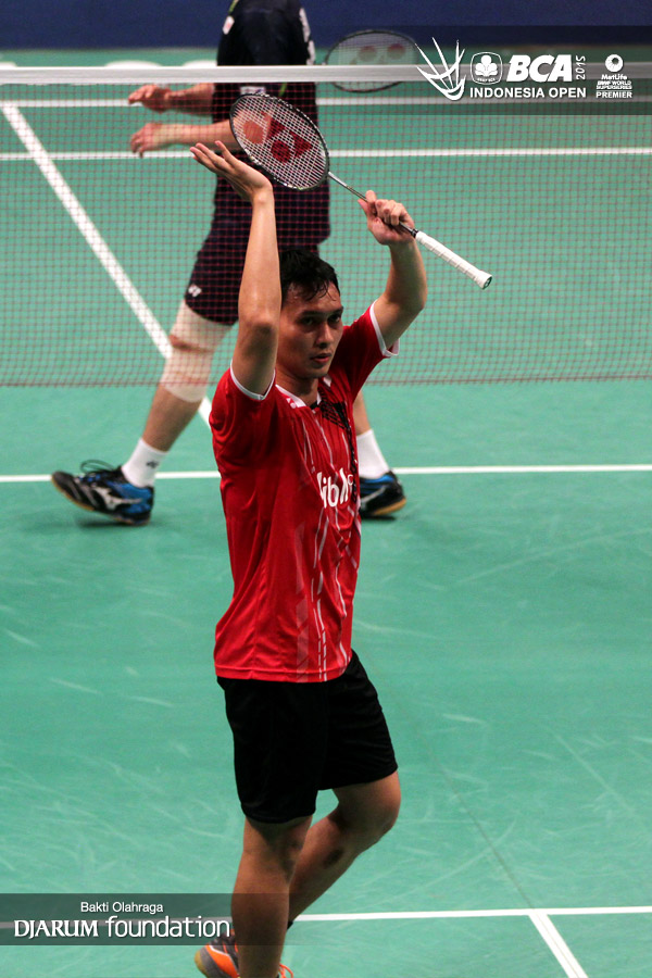 Mohamad Ahsan (Indonesia) memberikan apresiasi kepada seluruh pengunjung Istora Senayan yang telah mendukungnya.