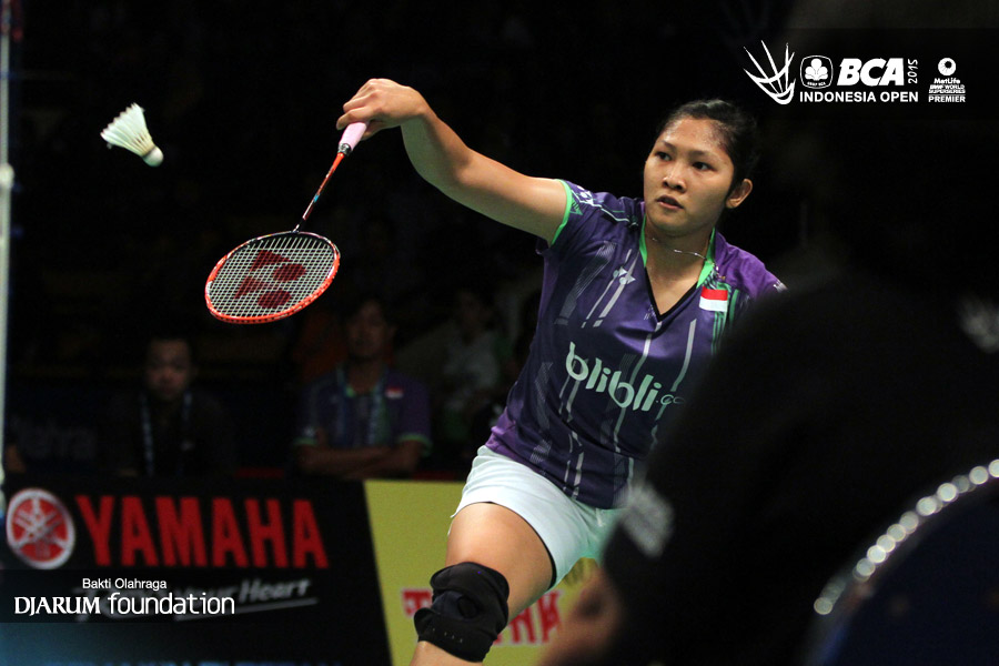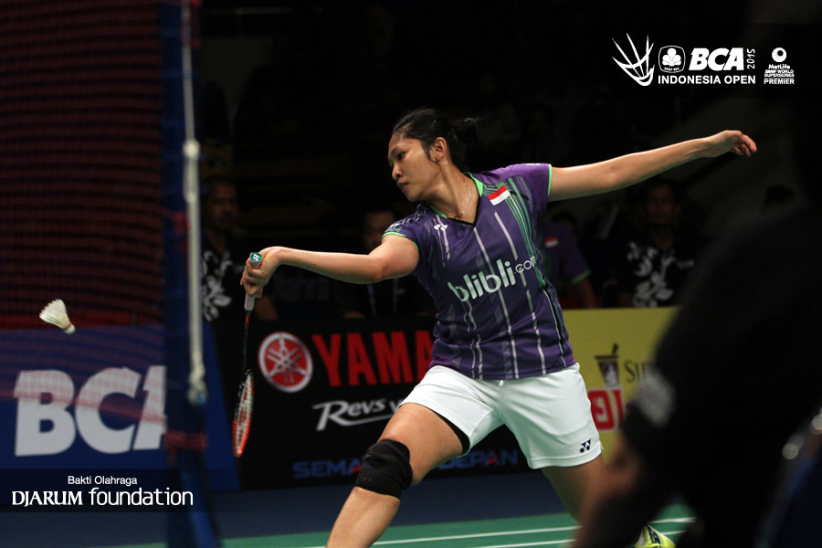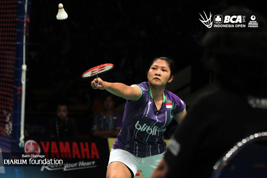 Lindaweni Fanetri (Indonesia) mengembalikan shuttlecock ke arah Ratchanok Intanon (Thailand).