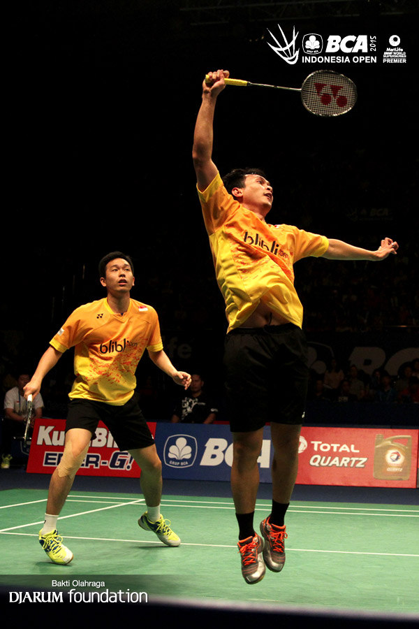 Hendra Setiawan/Mohamad Ahsan (Indonesia) melepaskan serangan ke arah Fu Haifeng/Zhang Nan (China).