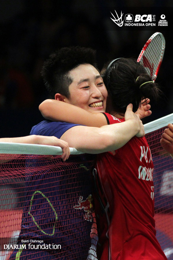 Yu Yang (China) Dan Greysia Polii (Indonesia) saling berpelukan usai bertanding.