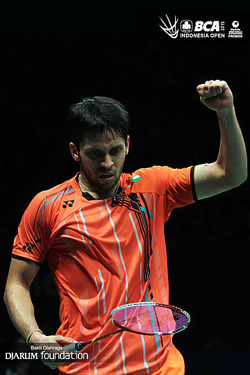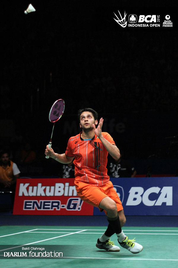 Kento Momota (Jepang) melepaskan serangan ke arah Parupali Kashyap (India).