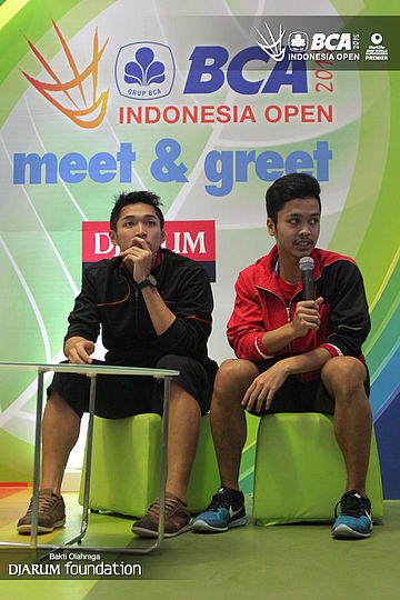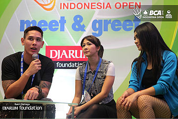 Jonatan Christie dan Anthony Ginting (Indonesia) menjawab pertanyaan pengunjung di area meet and greet.