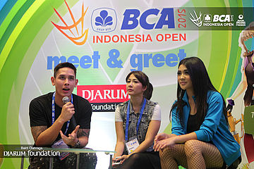 (Dari kiri) Ganindra Bimo, Andrea Dian, Indah Dewi Pertiwi saat meet and greet dengan pengunjung BCA Indonesia Open Super Series Premier 2015.