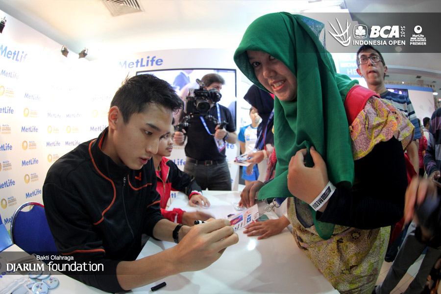 Jonatan Christie (Indonesia) memberikan tanda tangan kepada pecinta bulutangkis.