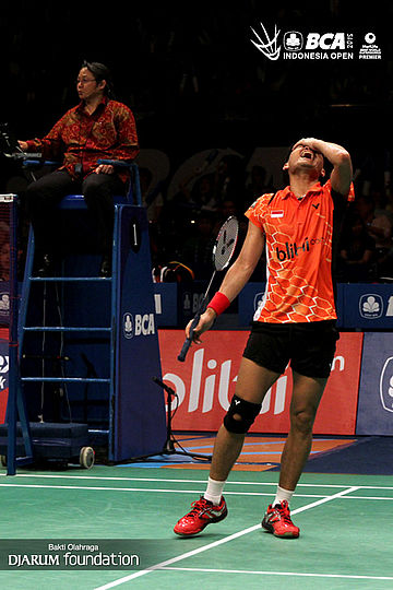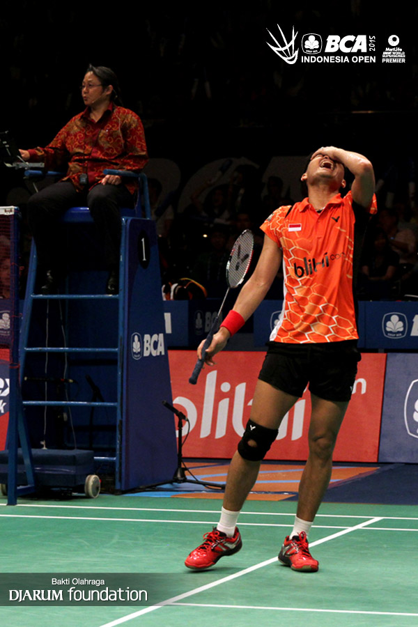 Ekspresi kekecewaan Tontowi Ahmad (Indonesia).