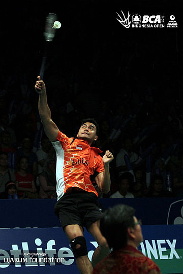 Tontowi Ahmad (Indonesia) melepaskan smash.