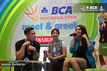 (Dari kiri) Ganindra Bimo, Andrea Dian, Indah Dewi Pertiwi saat meet and greet dengan pengunjung BCA Indonesia Open Super Series Premier 2015.