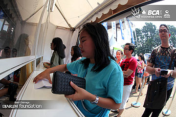 Beberapa pengunjung sedang memilih merchandise di booth PB Djarum.