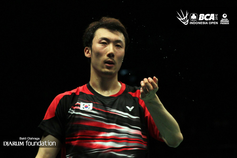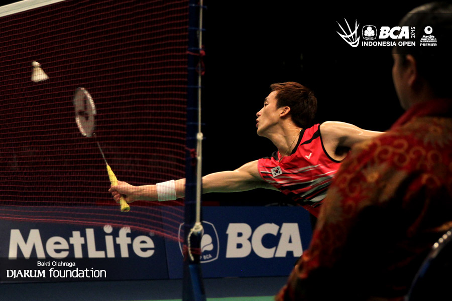 Ko Sung Hyun (Korea) bersiap menyambar pengembalian tanggung dari Lee Yong Dae/Yo Yoen Seong (Korea).
