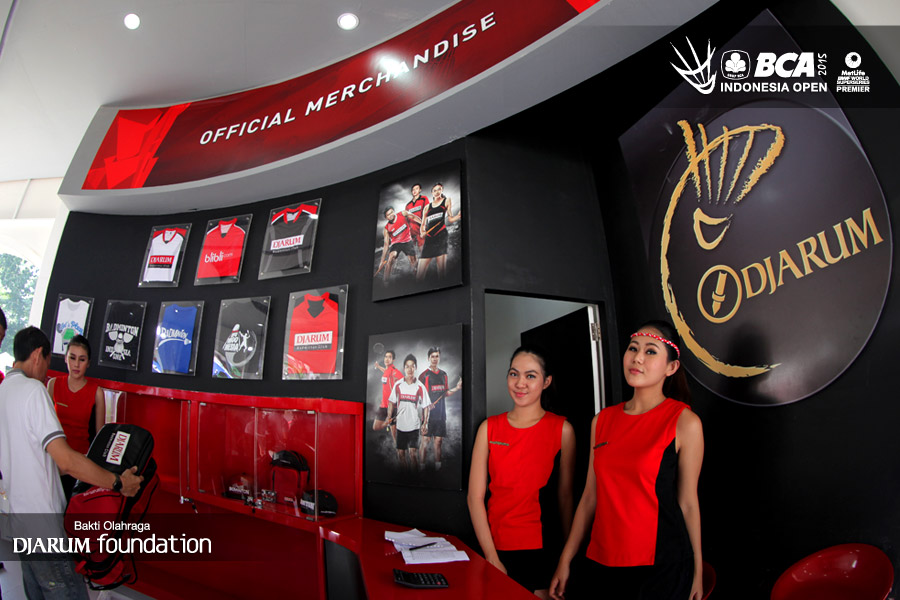 Dua usher berpose di booth merchandise PB Djarum.