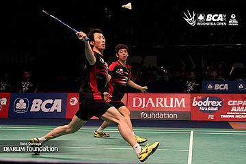 Ko Sung Hyun/Shin Baek Choel (Korea) melepaskan serangan ke arah Lee Yong Dae/Yo Yoen Seong (Korea).