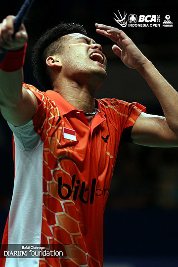Ekspresi kekecewaan Tontowi Ahmad (Indonesia).