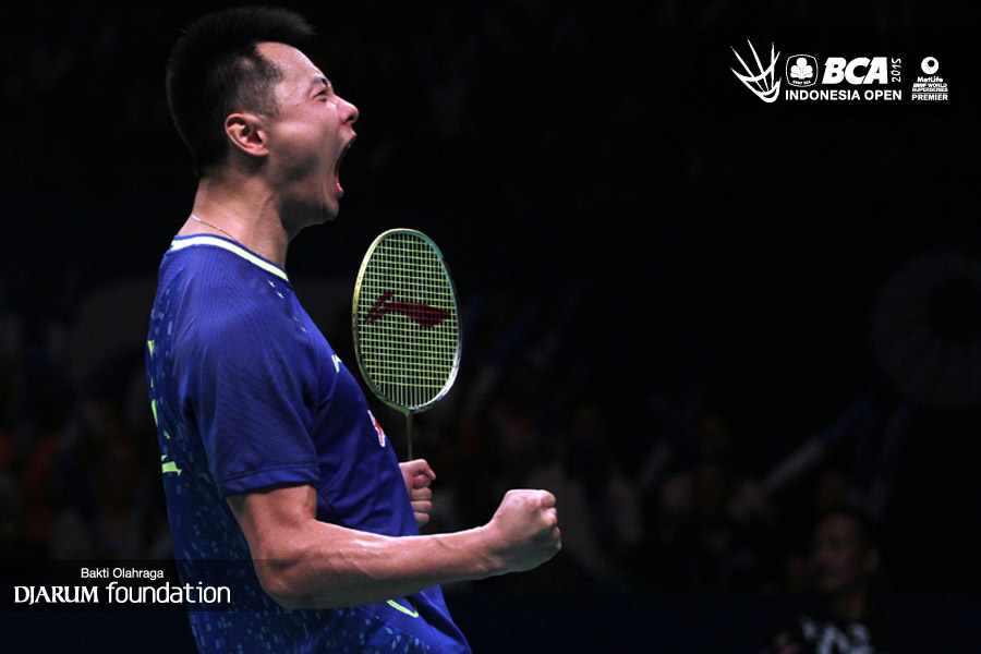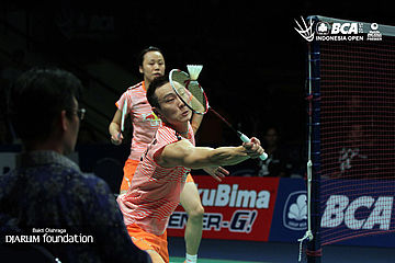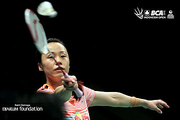 Zhao Yunlei (China) mengembalikan shuttlecock