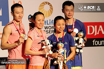 Zhang Nan/Zaho Yunlei (China) dan Xu Chen/Ma Jin (China) di podium juara
