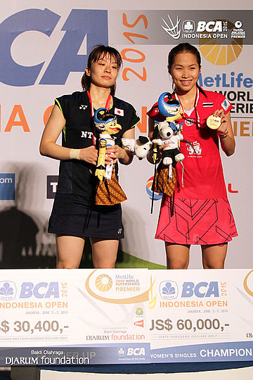 Yui Hashimoto (Jepang) dan Ratchanok Intanon (Thailand) saat di podium juara