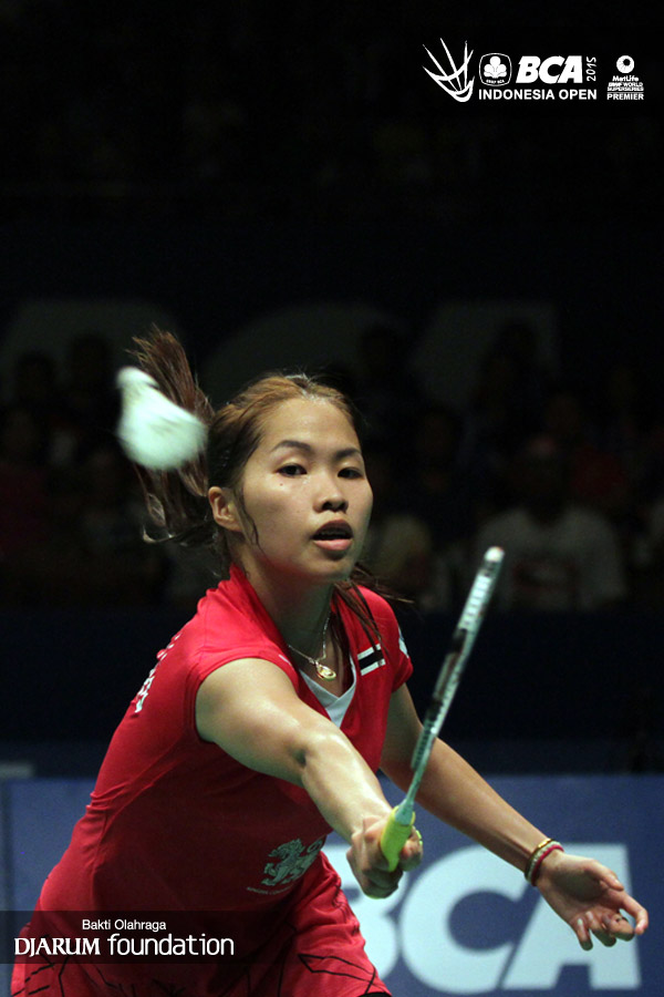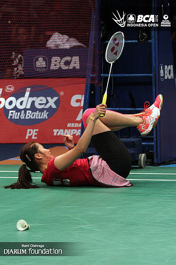 Ratchanok Intanon (Thailand) terjatuh saat berusaha mengembalikan shuttlecock