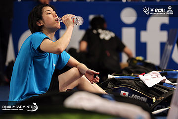 Ayane Kurihara (Jepang) meneguk minuman usai berlatih