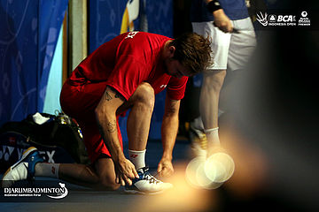 Jan O Jorgensen (Denmark) mengikat tali sepatu sebelum memulai latihan