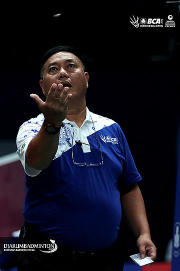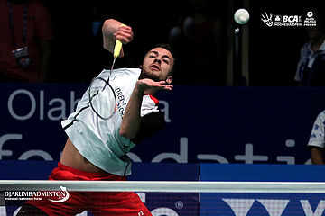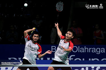 Akbar Bintang/Angger Sudrajat (Indonesia) mengembalikan shuttlecock