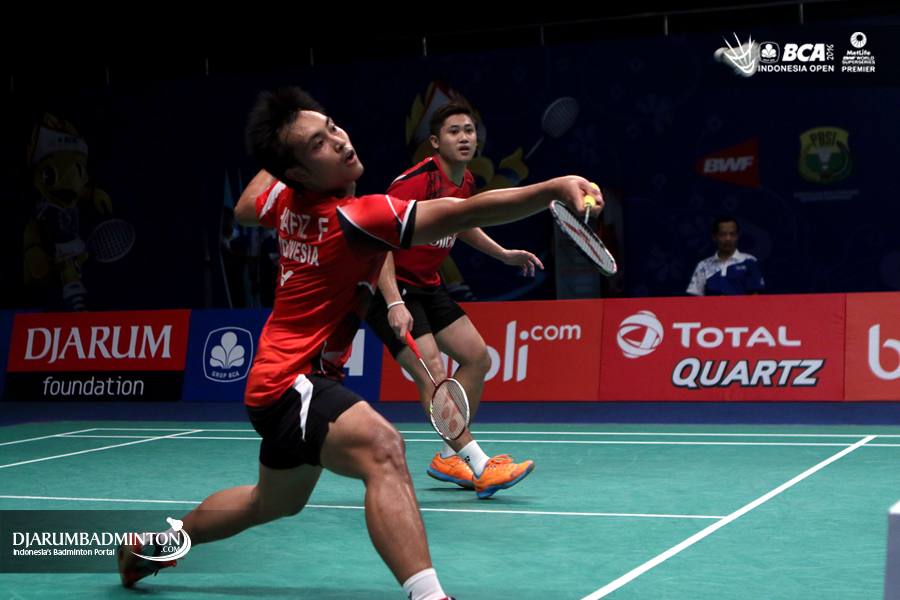 Wahyu Nayaka/Hafiz Faisal (Indonesia) mengembalikan shuttlecock