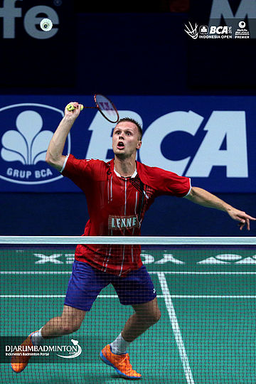 Raul Must (Estonia) bersiap menyambar pengembalian tanggung