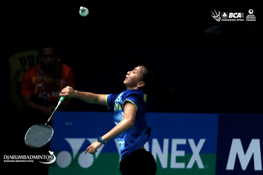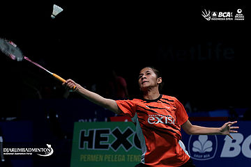 Gabriela Meilani Moningka (Indonesia) mengembalikan shuttlecock