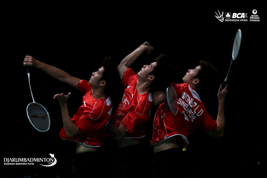 Zi Liang Derek Wong (Singapura) melepaskan smash