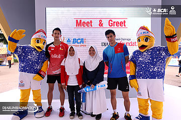 M Bayu Pangisthu dan Shesar Hiren Rhustavito (Indonesia) berphoto seusai meet and greet di booth Djarum Foundation