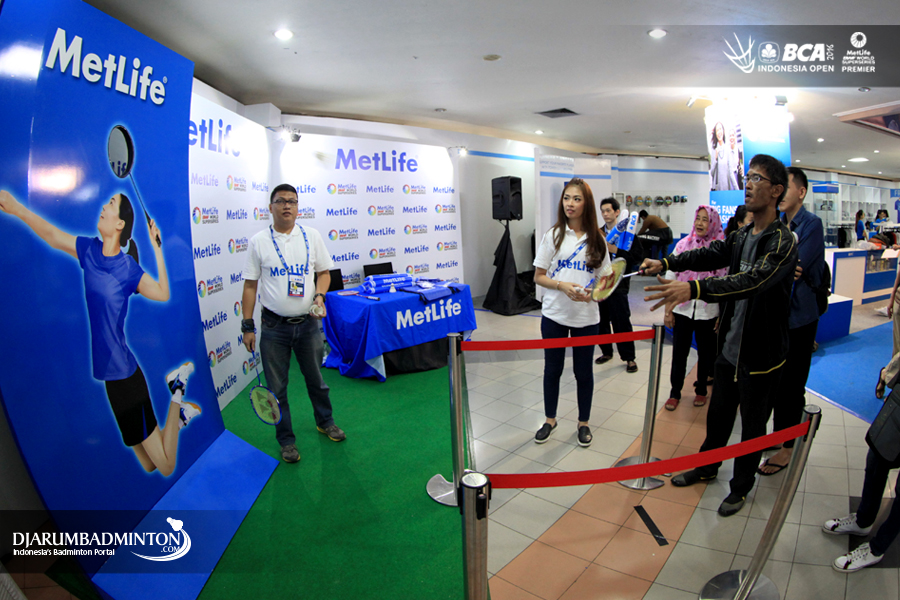 Salah seorang pengunjung sedang bermain games di booth Metlife