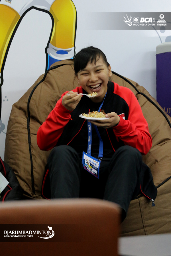 Gabriela Meilani Moningka (Indonesia) menyantap makanan di player lounge