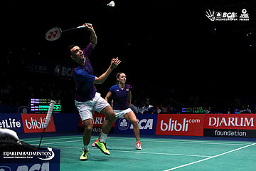 Alfian Eko/Annisa Saufika (Indonesia) mengembalikan shuttlecock