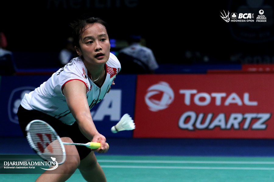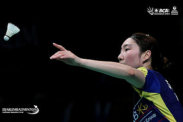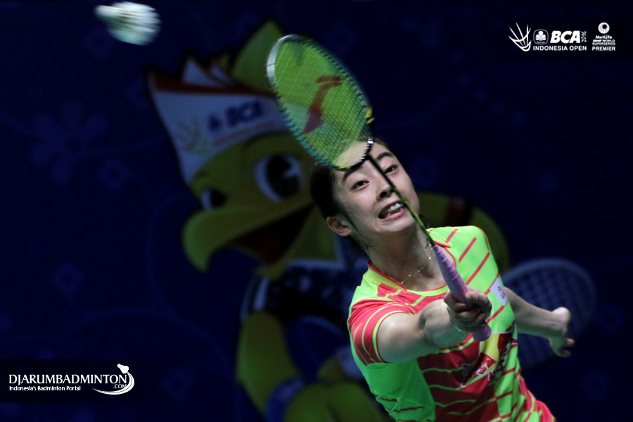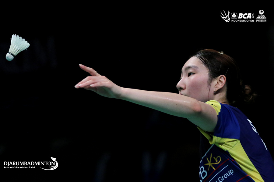 Sung Ji Hyun (Korea) mengembalikan shuttlecock