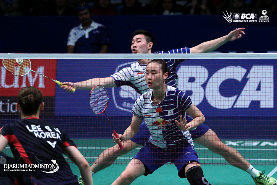 Liu Cheng/Bao Yixin (Tiongkok) mengembalikan shuttlecock