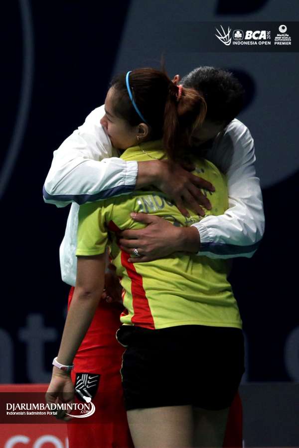 Febby Angguni (Indonesia) mendapatkan pelukan dari pelatihnya