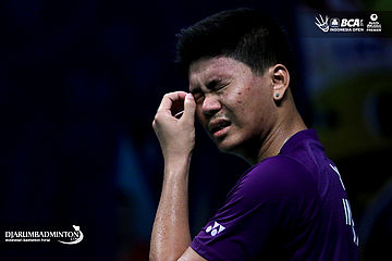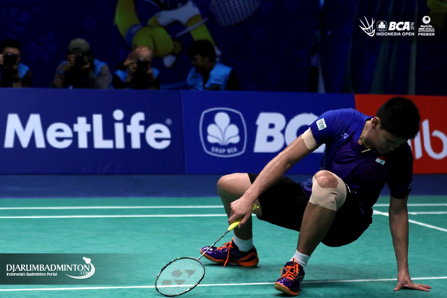 Praveen Jordan (Indonesia) terjatuh
