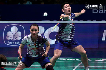 Lee Yong Dae/Lee So Hee (Korea) mengembalikan shuttlecock