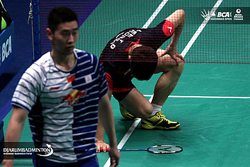 Lee Yong Dae (Korea) terjatuh saat berusaha menggapai pengembalian