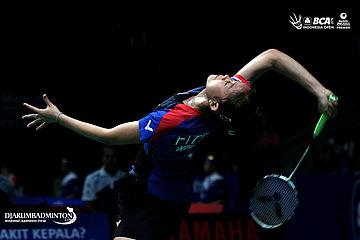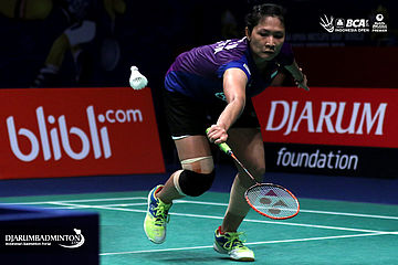Gregoria Mariska (Indonesia) mengembalikan shuttlecock