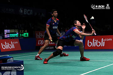 Alfian Eko/Annisa Saufika (Indonesia) mengembalikan shuttlecock