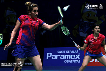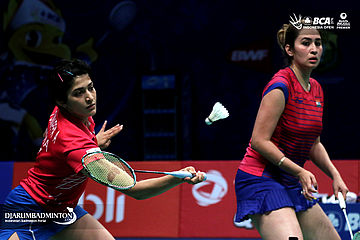 Ashwini Ponnappa/Jwala Gutta (India) menghadang serangan